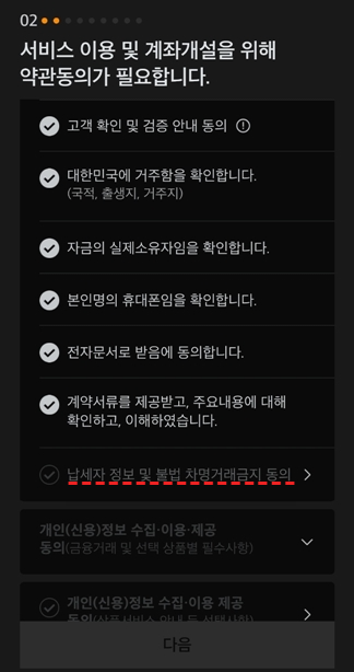 6. 약관 중, '납세자 정보 및 불법 차명거래금지 동의' 부분에서는 아래와 같이 선택해 줍니다. 이어서 이어지는 다른 약관도 확인 후 동의해 줍니다.